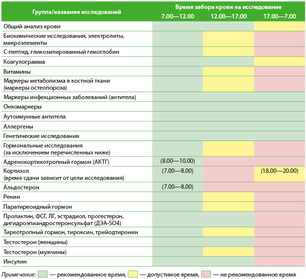Время суток. Концентрация многих веществ в человеческом организме циклично изменяется в течение суток. Это касается не только гормонов, но и некоторых биохимических показателей, и специфических маркеров (например, маркеров обмена веществ в костной ткани). По этой причине некоторые тесты рекомендуется сдавать строго в определенное время суток. В случае проведения мониторинга лабораторного показателя повторная его сдача должна происходить в одно и то же время. В таблице ниже представлены рекомендации по времени забора крови для определения различных лабораторных показателей.